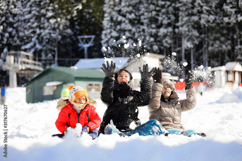 Asian girls playing snow happily in japan. , Children playing in the snow , Children playing in the snow happily.Asian boy playing snow happily in japan.