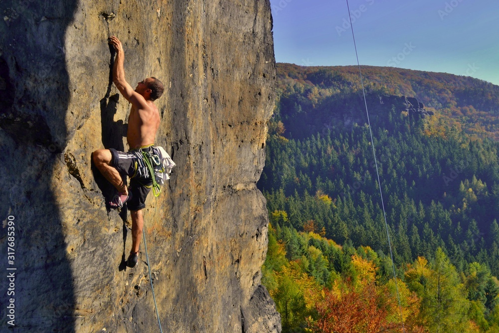 Young man is climbing on the sandstone rock in Sachsen Switzerland. Beautiful autumn day in Germany.
