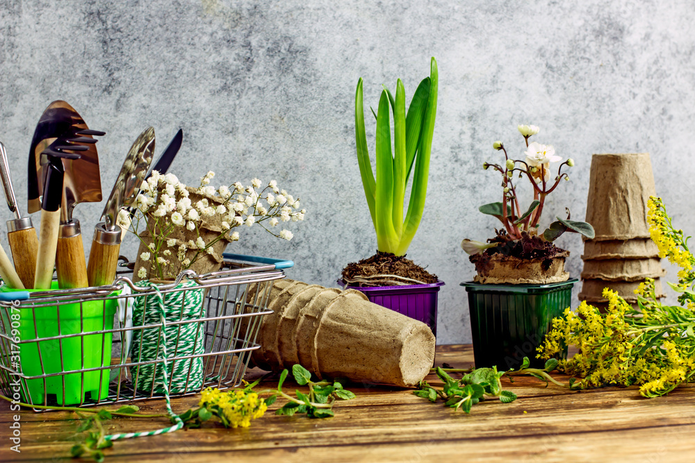 Gardening tools and flowers on wooden background. Spring flowers hyacinths, primroses, planting stock, rakes, shoulder blades, twine, glasses under seedlings on a wooden table.