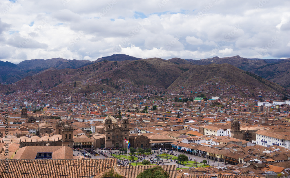 Panoramic view of the central square of Cusco in the center of Cusco Peru