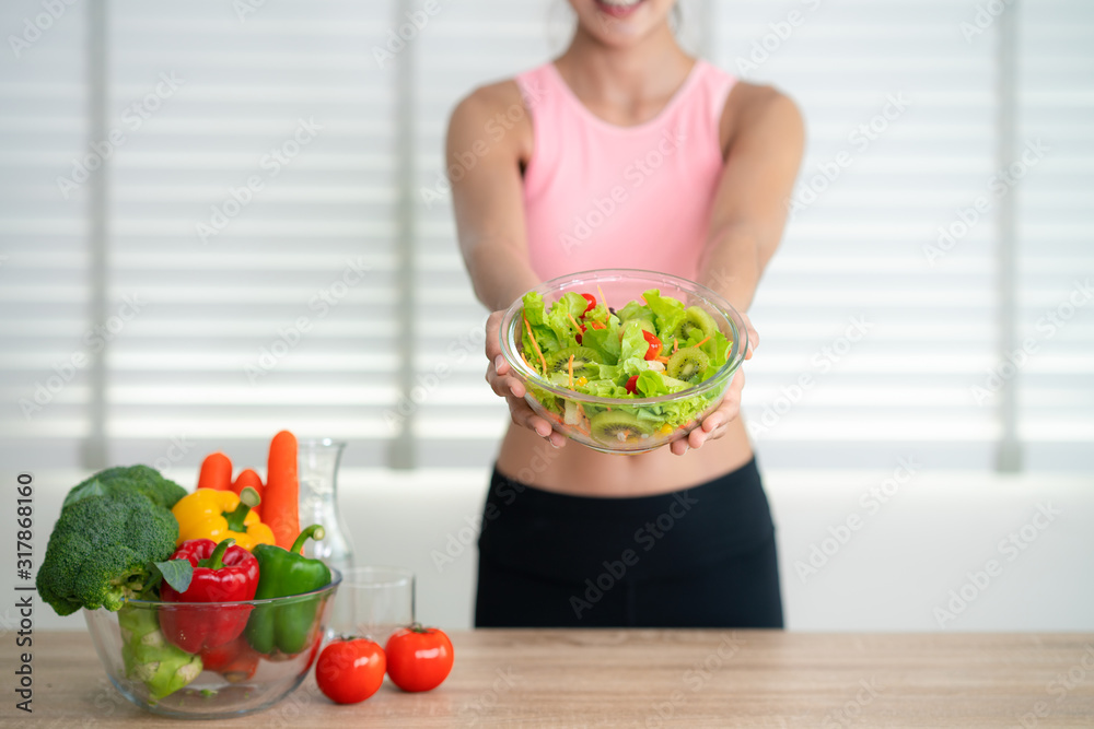 Asian girl eat clean food after exercise at home