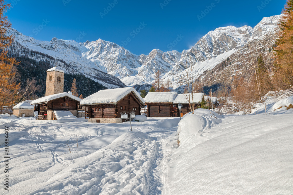 Wonderful winter landscape with snow in italian Alps. Macugnaga, Italy