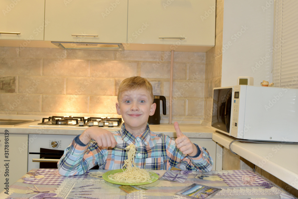 The boy has breakfast pasta.
