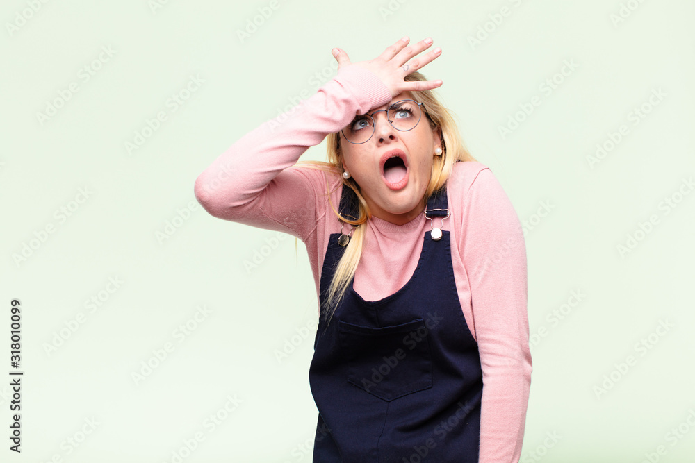young pretty blonde woman raising palm to forehead thinking oops, after making a stupid mistake or remembering, feeling dumb against flat wall