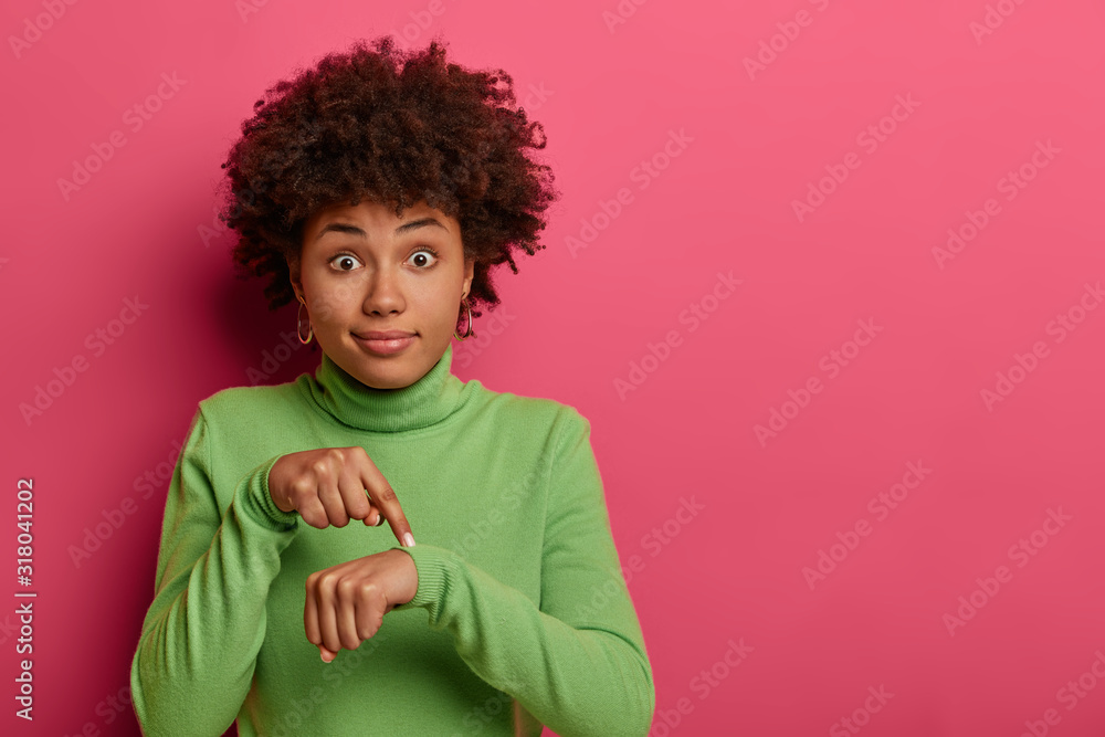 Time to go, hurry up! Shocked ethnic woman points at wrist, makes time gesture, shows we should do everything quickly, dressed in green clothes, stands against pink background. Its too late.