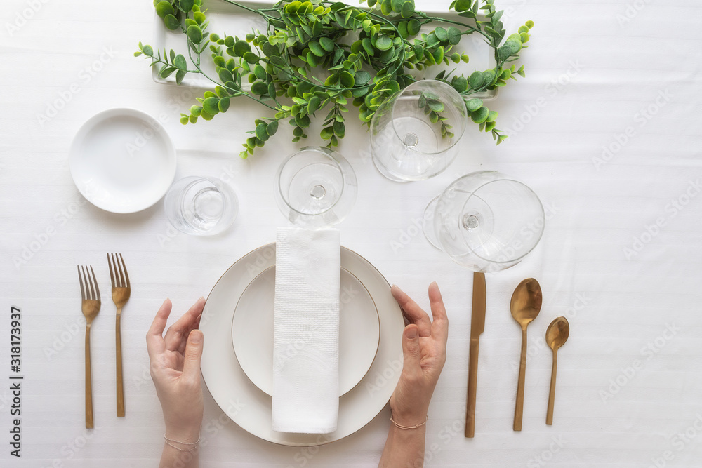 Female hand holding porcelain plate. Elegant table setting with tableware and decorations for dinning.