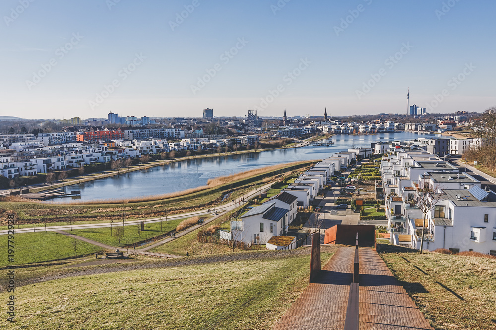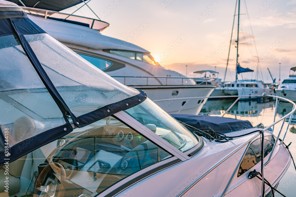 Cockpit and control panel of a small marine boat. Beautiful clear sunset in the sea harbor with moored yachts.