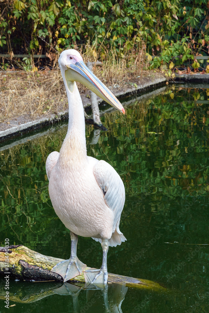 Pink large Pelican Pelecanus on the branches of fallen trees. Bird of the family Pelecanidae with a huge beak.
