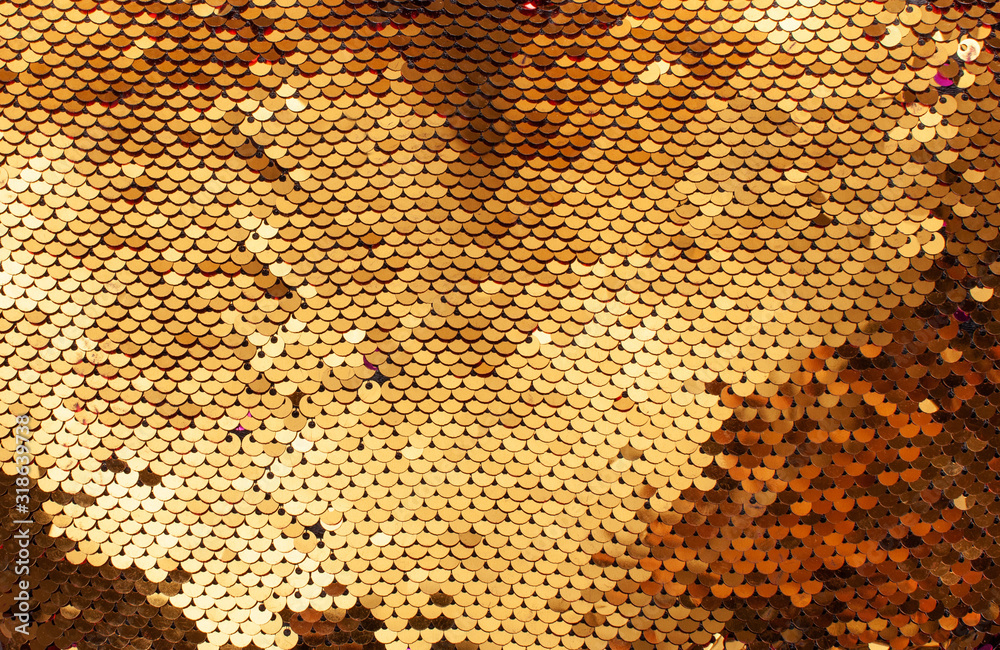 Background texture of gold iridescent scales on fabric