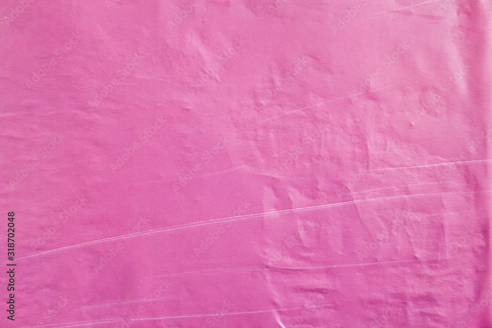 Purple crumpled and scratched poster glued on street billboard. Purple wavy paper placard texture background.