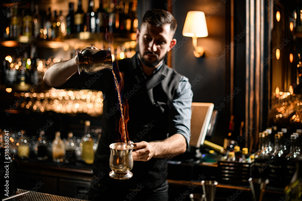 Bartender pouring a transparent alcoholic drink from the one steel cup to another