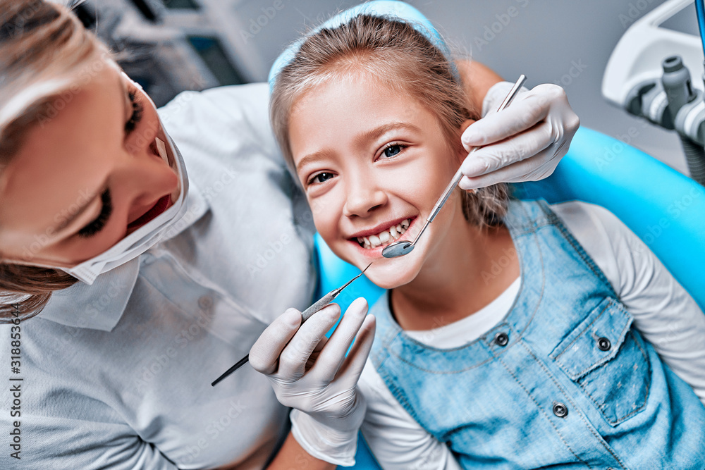 Beautiful kid girl smiling in dentist's chair the office treats teeth. Doctor mask and child looks at camera.