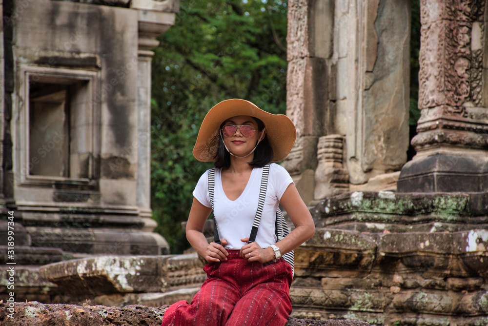 Beautiful, pretty, young Thai girl is exploring the ancient ruins of Angkor Wat (City/Capital of Temples) Hindu temple complex in Siem Reap, Cambodia. The largest religious monument in the world