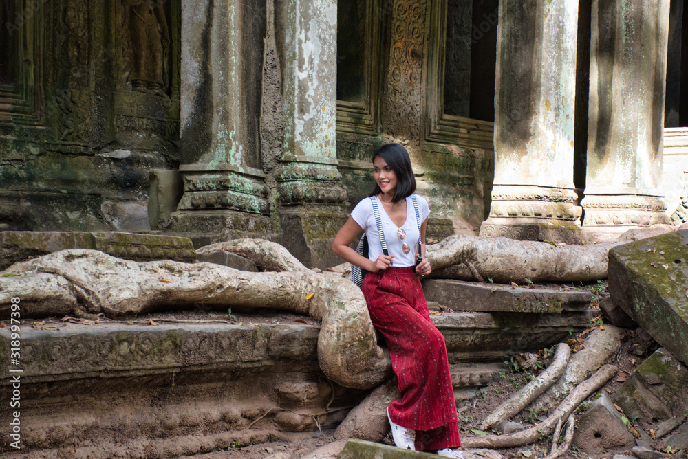 Beautiful, pretty, young Thai girl is exploring the ancient ruins of Angkor Wat (City/Capital of Temples) Hindu temple complex in Siem Reap, Cambodia. The largest religious monument in the world