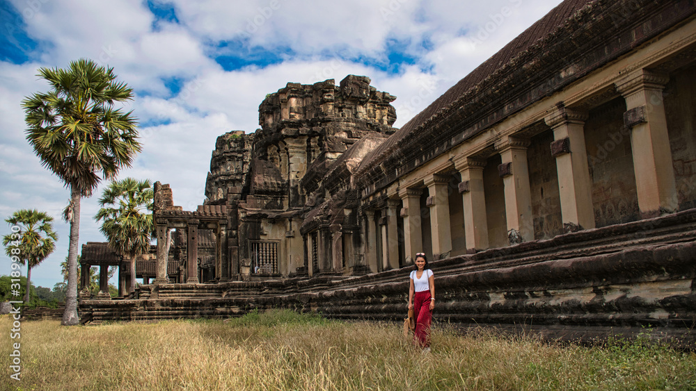Beautiful, pretty, young Thai girl is exploring the ancient ruins of Angkor Wat (City/Capital of Temples) Hindu temple complex in Siem Reap, Cambodia. The largest religious monument in the world