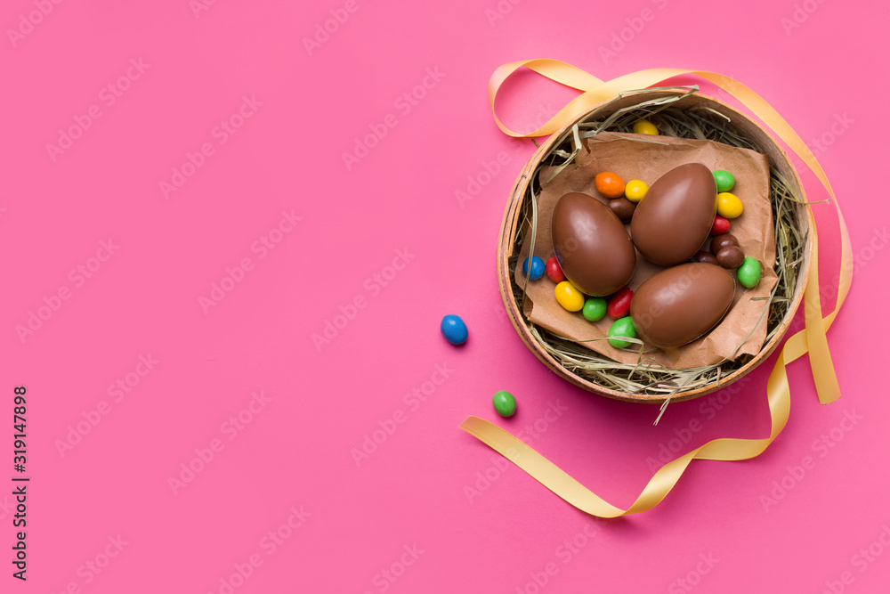 Easter chocolate eggs and candies on a pink background. have copy space. Easter concept for kids