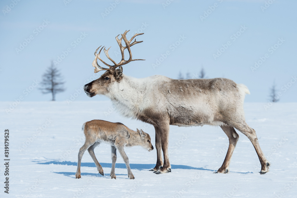 reindeer in the spring, female reindeer with offspring