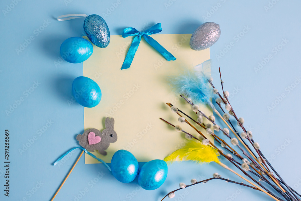 Happy Easter day. A yellow sheet of paper surrounded by blue Easter eggs, pussy-willow twigs, decorative Easter hare, flowers on a blue background, top view, copy space. Easter festive background