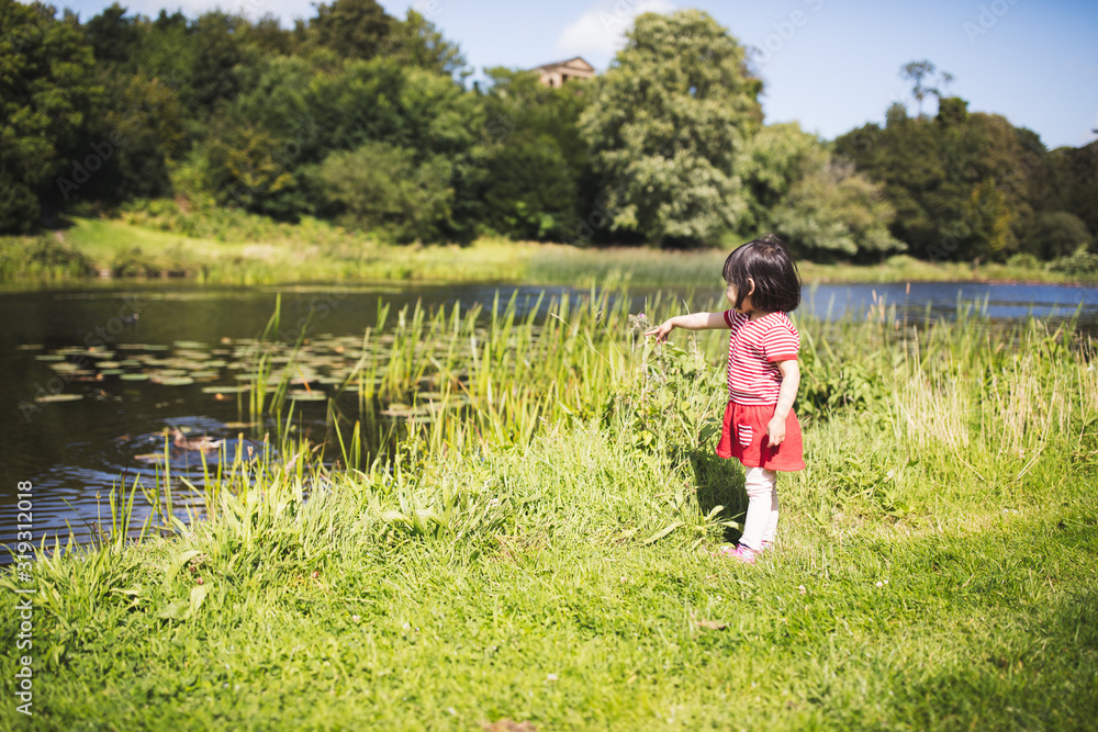 toddler girl playing in summer countryside forest park,Northern Ireland
