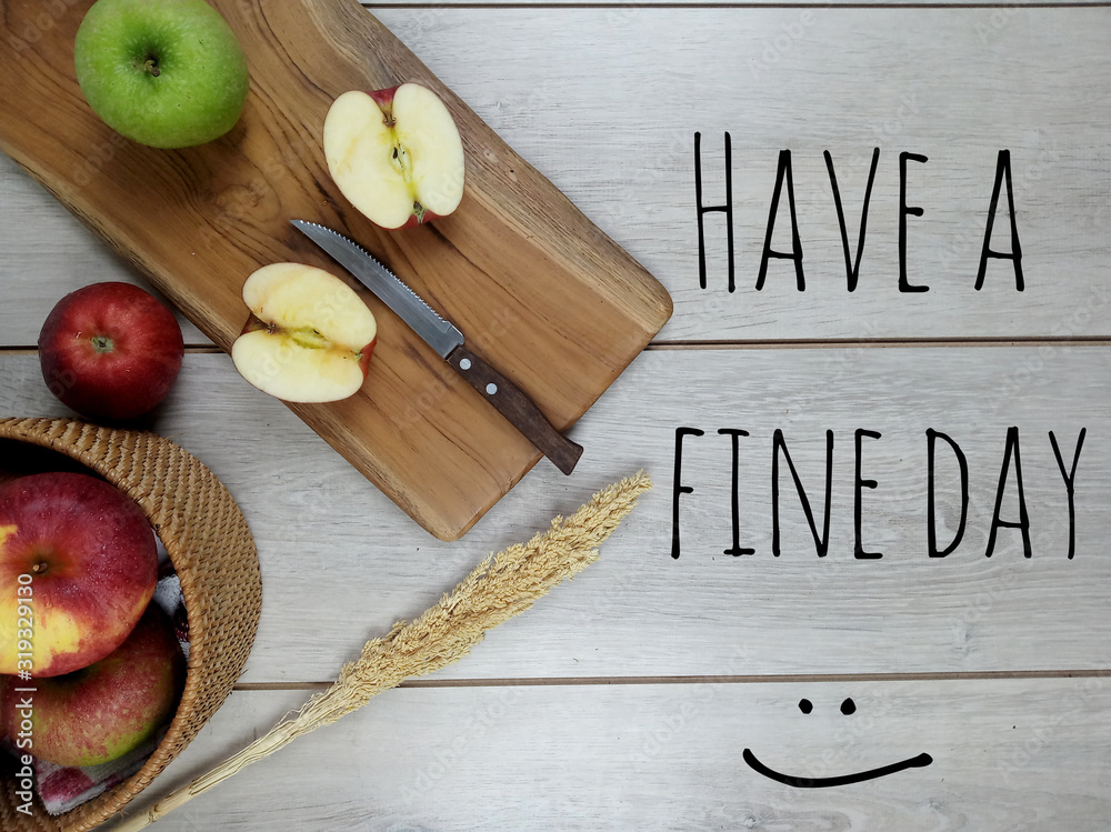 Inspirational quote - Have a fine day. With a smiling face sign, knife, fresh green and red apple fruits on a basket and cutting board on wooden table. Motivational greeting words concept.