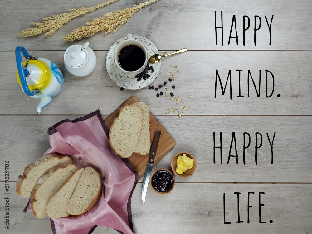 Inspirational quote - Happy mind, Happy life. With morning breakfast of brown bread, a cup of hot black coffee, teapot, sugar, butter, fruit jam and roasted coffee beans on wooden table.