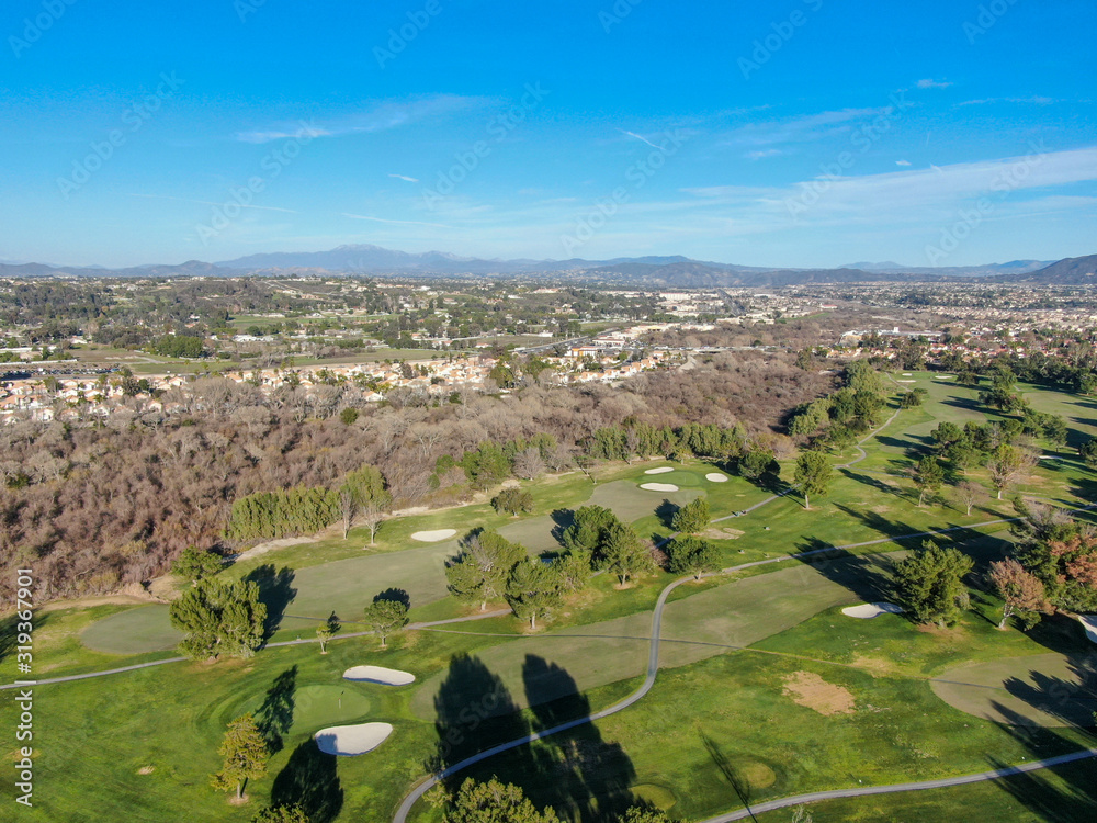 Aerial view of golf course with green field in the valley. Green turf scenery. Temecula, California, USA