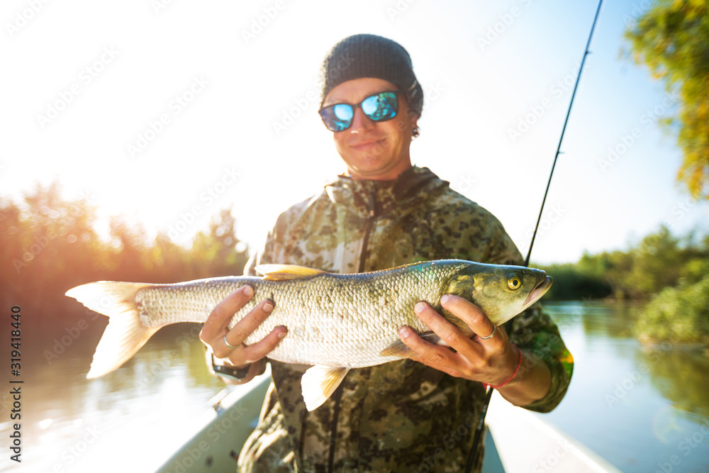Happy angler holds Asp fish (Aspius aspius) being on the boat and smiles. Astrakhan region, Russia