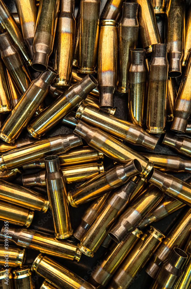Background from empty cartridges for rifles and carbines. Shiny brass shells scattered on the surface.