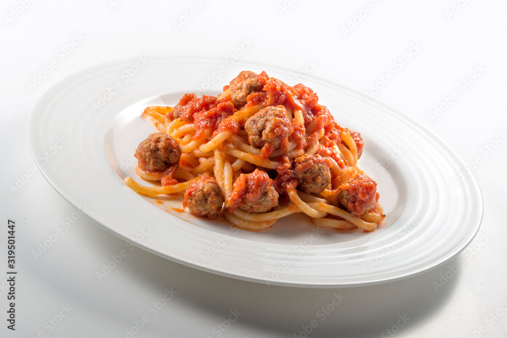 Plate of spaghetti with tomato and meatballs