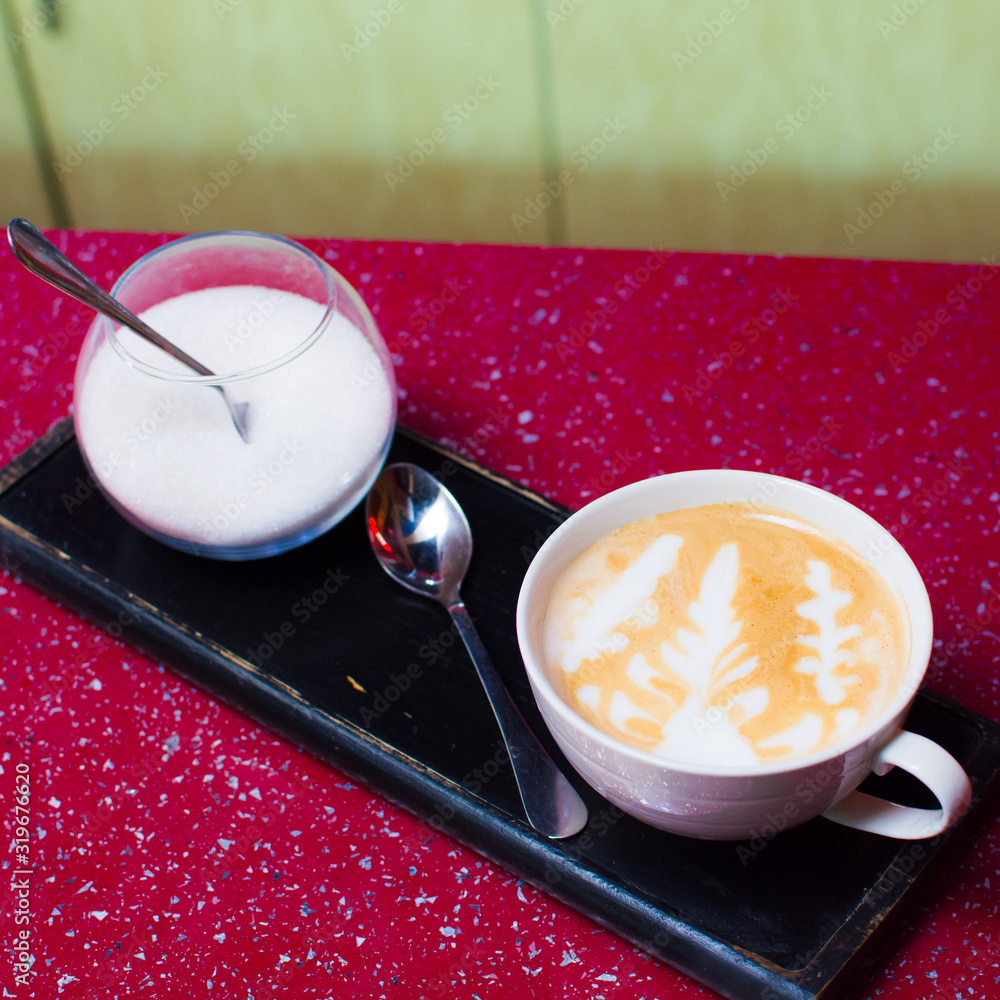 mug of hot cappuccino coffee on a stand with sugar
