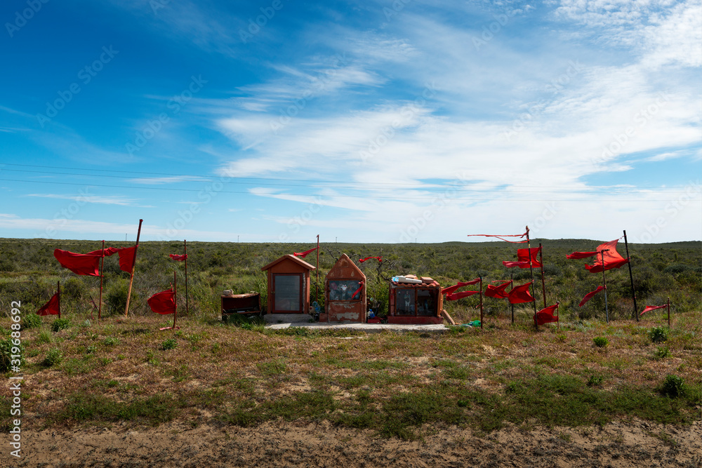A Guachito Gil shrine with red flags along a road at the Valdes Peninsula in Argentina, South America.
