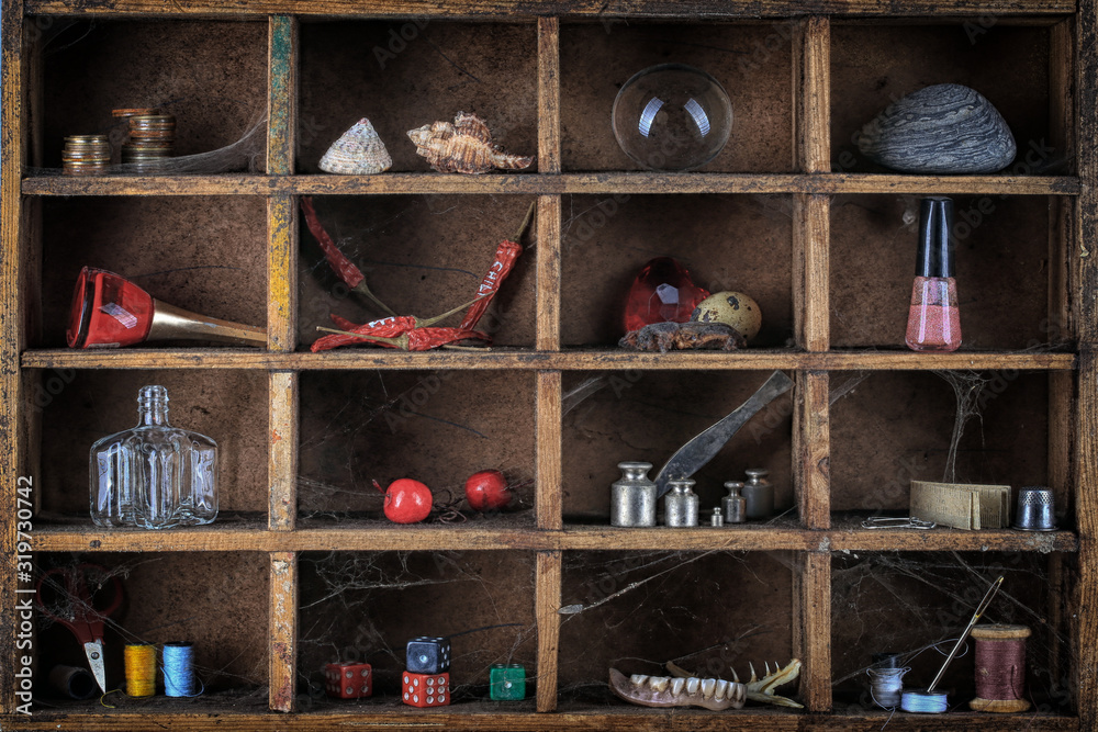 Wooden box catalog with cobwebs and various little things
