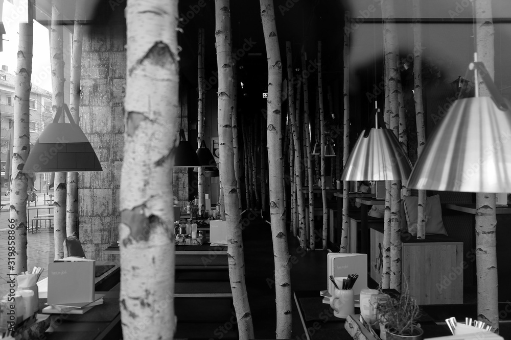 Inneneinrichtung einer eleganten Restaurantkette für Burger mit Stamm der Birke und Deckenleuchte aus Metall in der Innenstadt von Frankfurt am Main in Hessen in neorealistischem Schwarzweiß