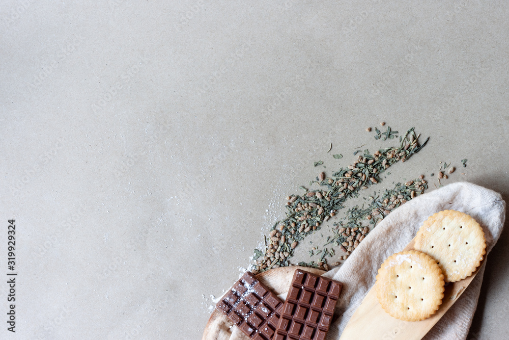 Chocolate, crackers and dried tea leaves with spatula and filter bags on paper..Breakfast and tea time concept