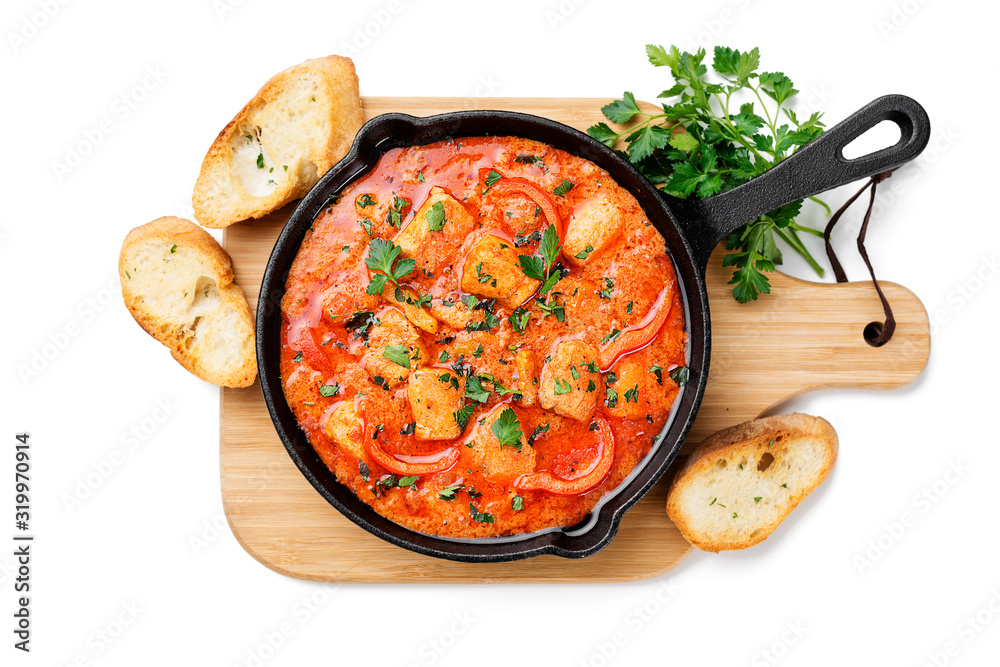 Fish Stew cooked in a delicious rich and fragrant broth, topped with fresh parsley and served with rice. isolated on white background