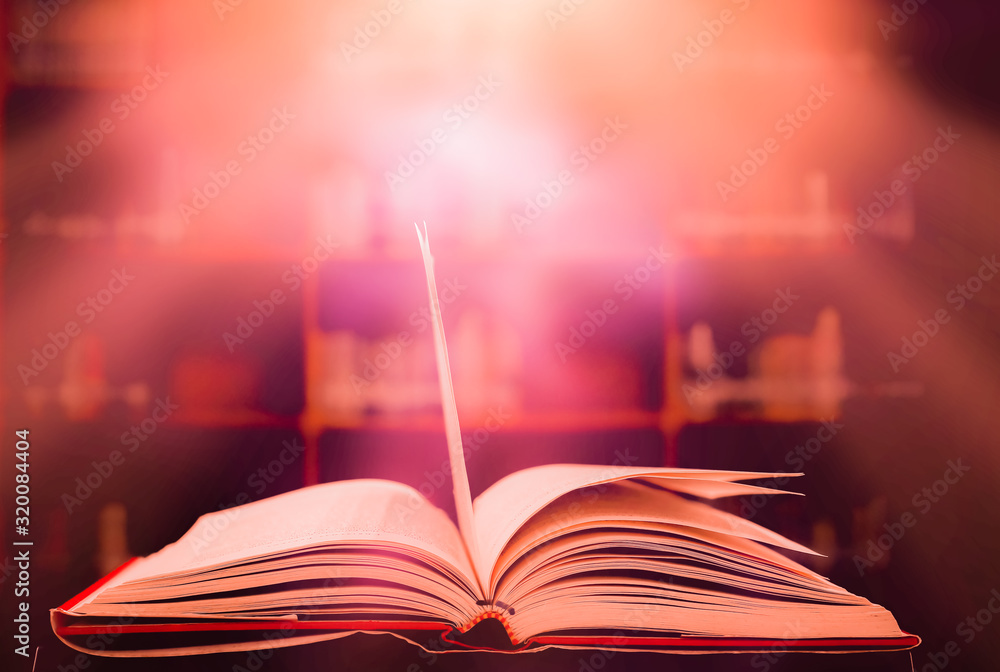 The blurred book that is bewitched with magic, the magic light in the dark, with the bright light shining down as the power to search for knowledge. For research and use as a blurred background