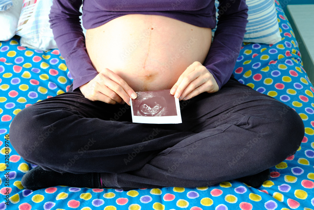 X-ray of a fetus and the belly that contains it during pregnancy. They belong to a young Caucasian woman.