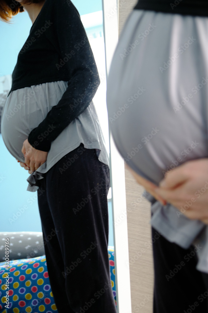 A young Caucasian woman looks at her belly in the mirror during pregnancy. Now the birth is near ...