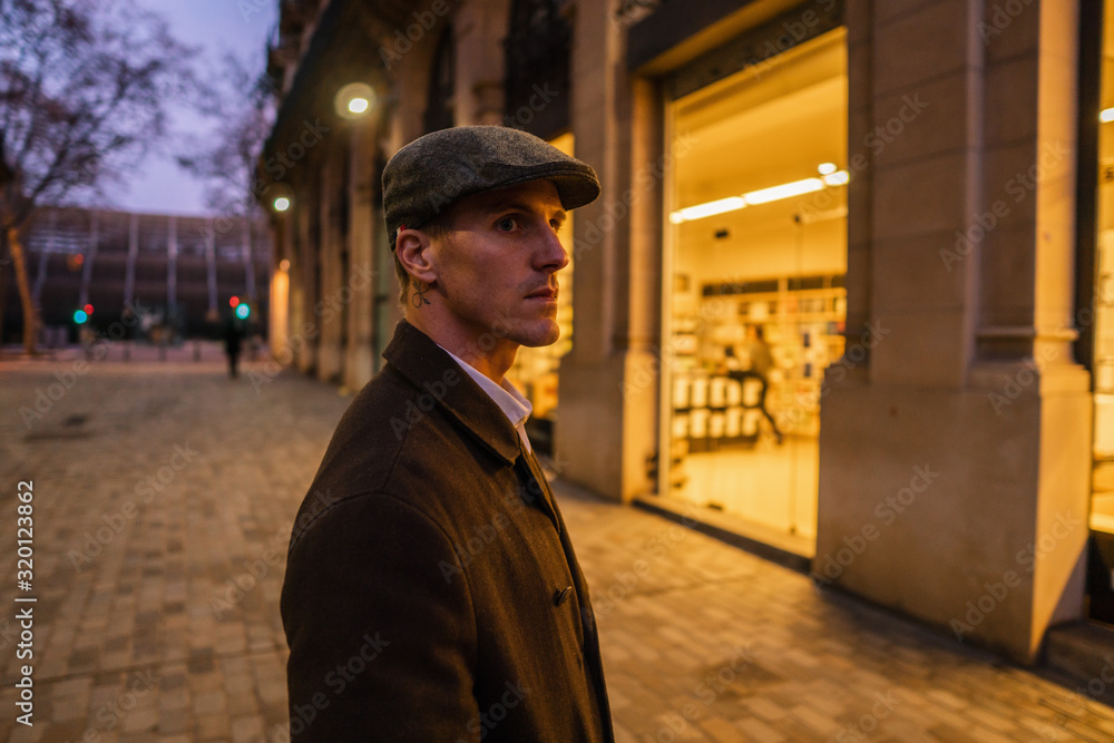 Old Fashion Man from the 1920s england walking along an old street of a historic city