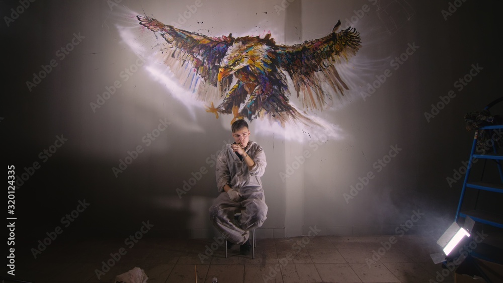 Artist designer draws an eagle on the wall. Craftsman decorator paints a picture with acrylic oil color. Vaper smokes vape. Painter painter dressed in a paint coat. Indoor. Dark magic cinematic look.