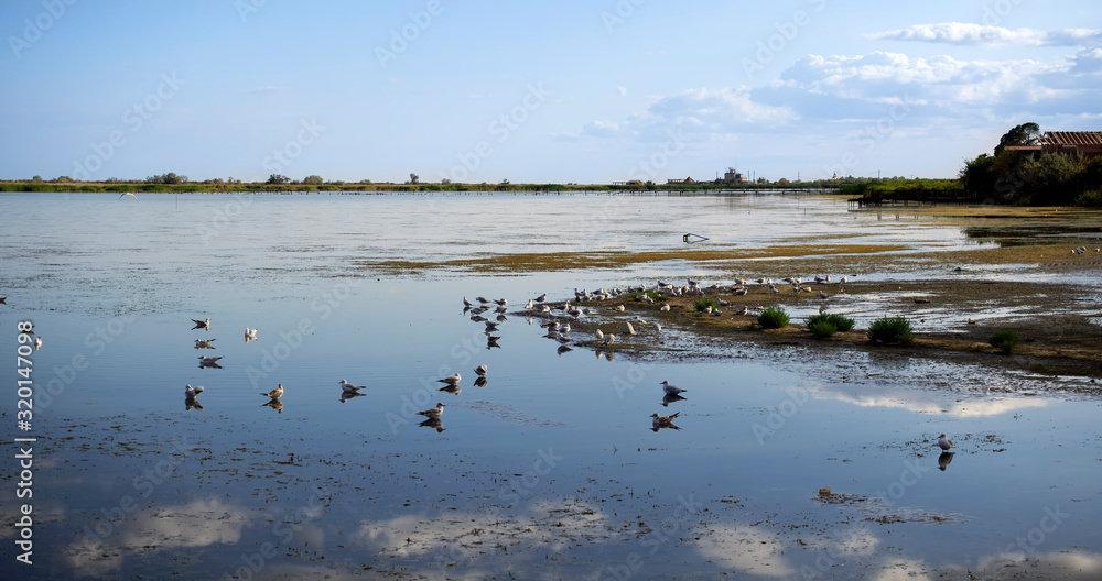 Shallow water on Maliy Sasik Lake. Small cluster of seagulls on Maliy Sasik Lake