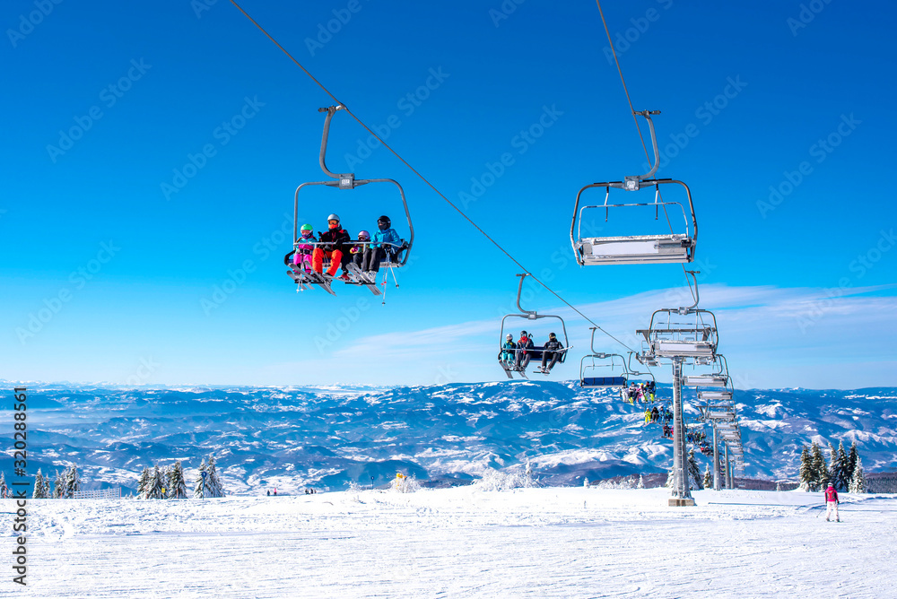 Skiers on ski lift at mountain ski resort with beautiful sky and mountains in the background