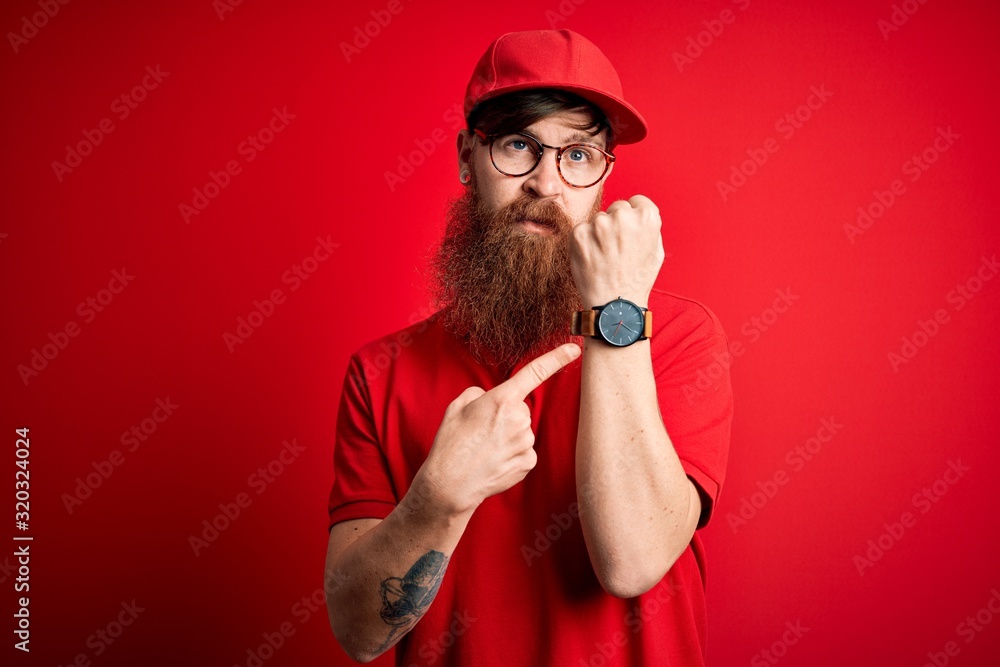 Young handsome delivery man wearing glasses and red cap over isolated background In hurry pointing to watch time, impatience, looking at the camera with relaxed expression