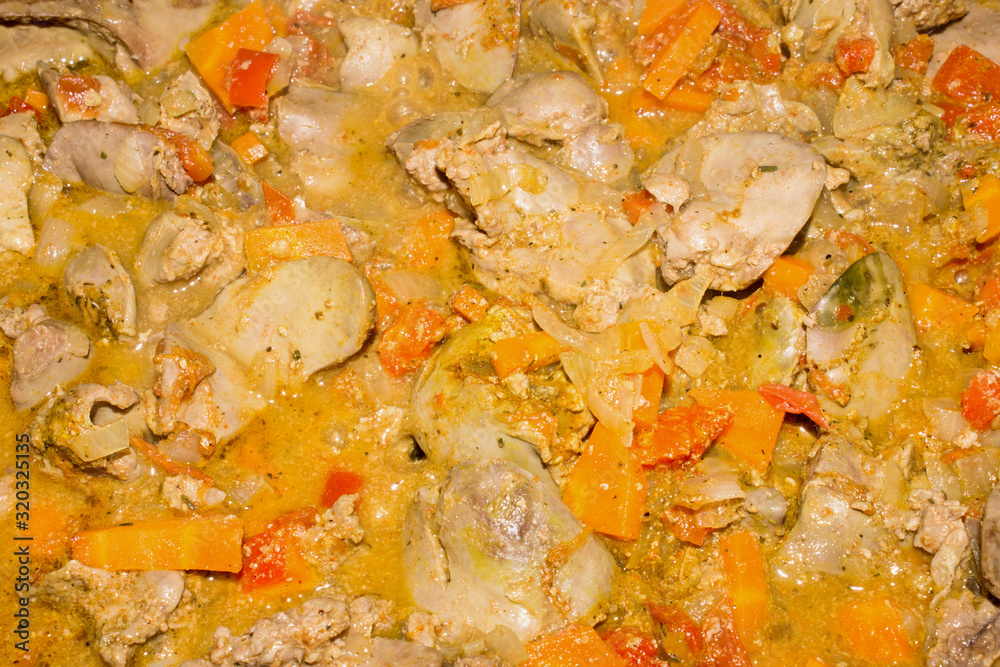 Chicken liver with vegetables.Stewed chicken liver.Background of the liver.