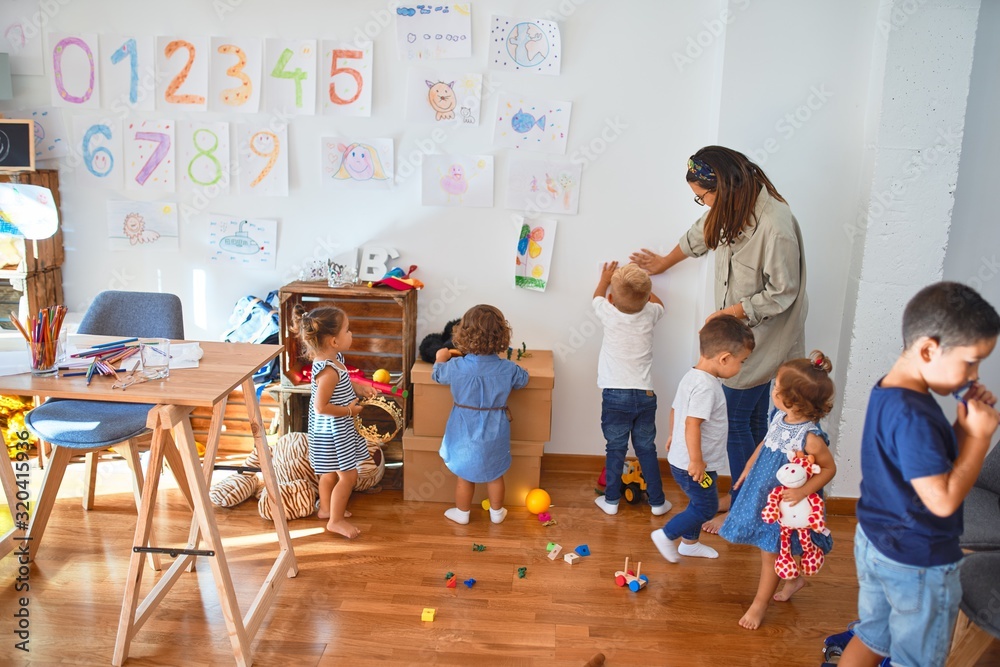 Beautiful teacher and group of toddlers playing around lots of toys at kindergarten