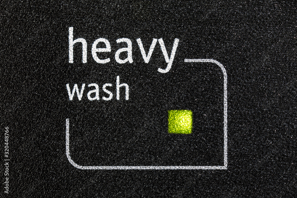 Macro close up photograph of heavy wash indicator light on dishwasher machine.
