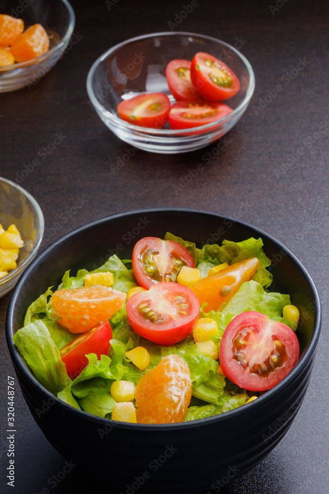 Salad of lettuce and cherry tomato,orange,corn in bowl.Concept for a tasty and healthy meal.vegetarian food healthy concept