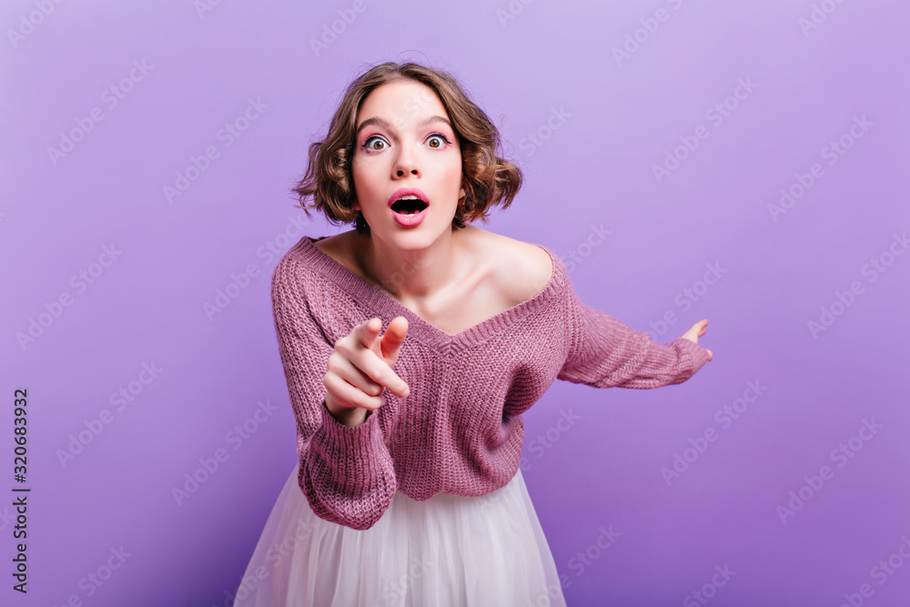 Cute girl with pink makeup expressing amazement and pointing finger. Indoor photo of curly shocked woman isolated on purple background.
