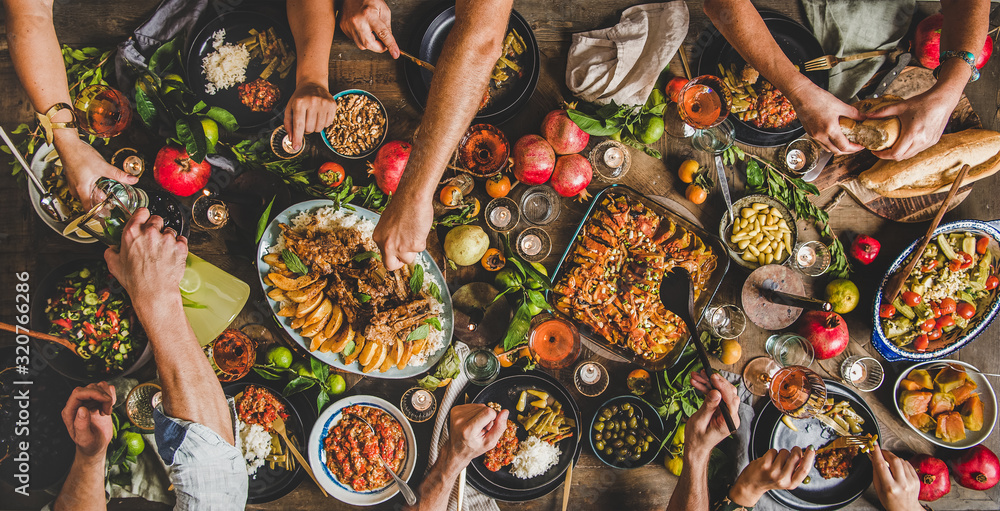 Turkish cuisine family feast. Flat-lay of peoples hands and lamb chops with quince, beans, salad, babaganush, rice pilav, pumpkin dessert, lemonade over rustic table, top view. Middle East cuisine