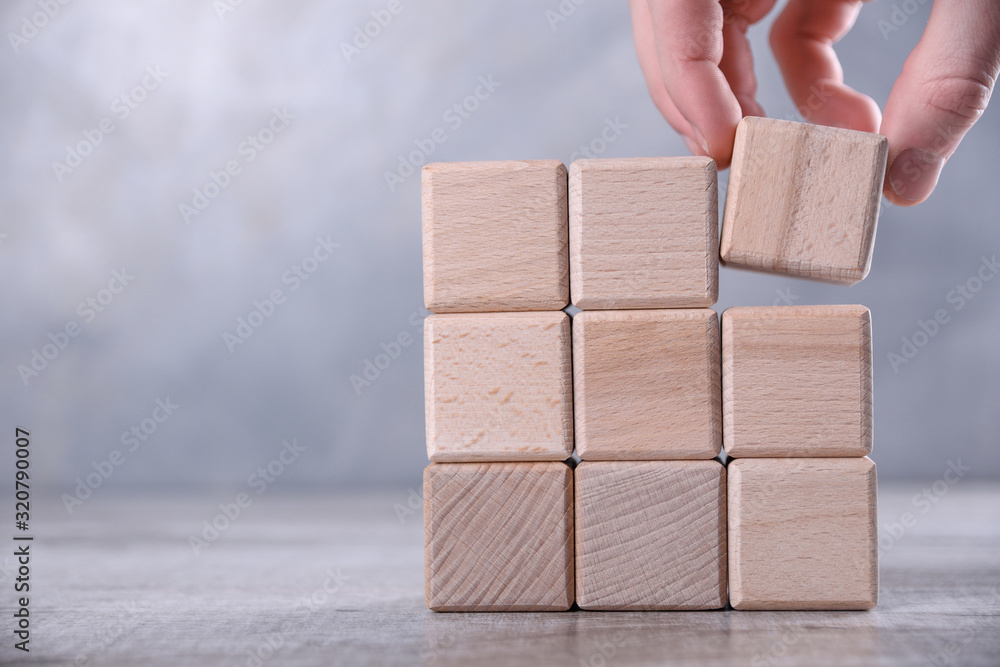 Hand arranging wood block stacking as step stair on wooden table. Business concept for growth success process. Copy space